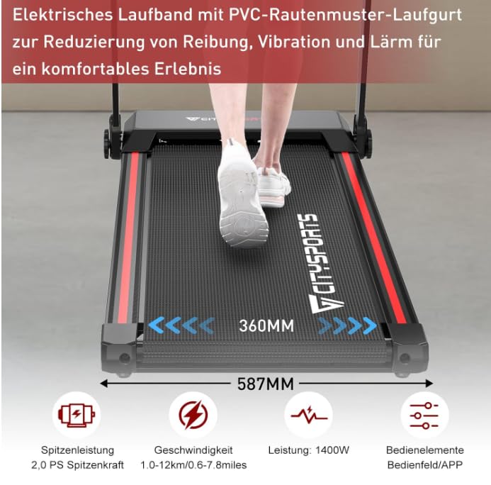 - 【Faltbares Laufband mit Bluetooth】 CITYSPORTS Laufband ist eine professionelle Marke von Laufband für Zuhause. Unser faltbares Laufband ist mit Handlauf und 360° Tabletshalterung ausgestattet, so dass Sie Ihr IPAD auf den Ständer stellen können. Dieses Laufband verfügt über einen integrierten Surround-Sound-Bluetooth-Lautsprecher. Es kann mit Bluetooth verbunden werden, um während des Laufens oder Gehens Video oder Musik abzuspielen.