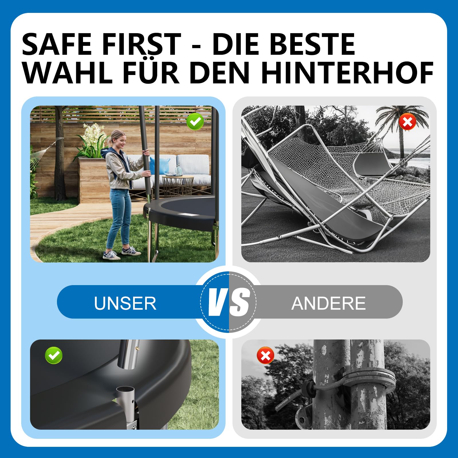 - 【Besserer Schutz für Kinder】Unser Gartentrampolin ist sicherheitszertifiziert. Das schwere Polyethylen-Sicherheitsnetz bedeckt die gesamte Sprungfläche und hat eine Höhe von 180 cm mit zusätzlichen Reißverschlüssen und Sicherheitsclips für zusätzlichen Schutz. Die Ränder sind mit dickem EPE-Schaumstoff gepolstert und die Stangen sind ebenfalls mit EPE-Schaumstoff gepolstert, um zusätzlichen Schutz beim Springen zu bieten.