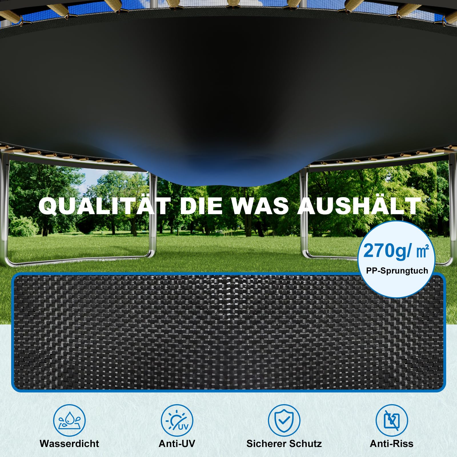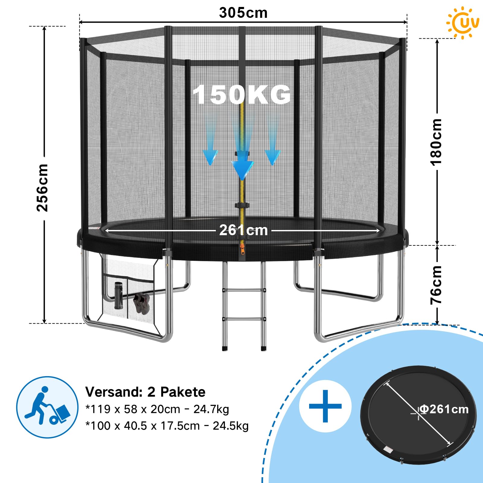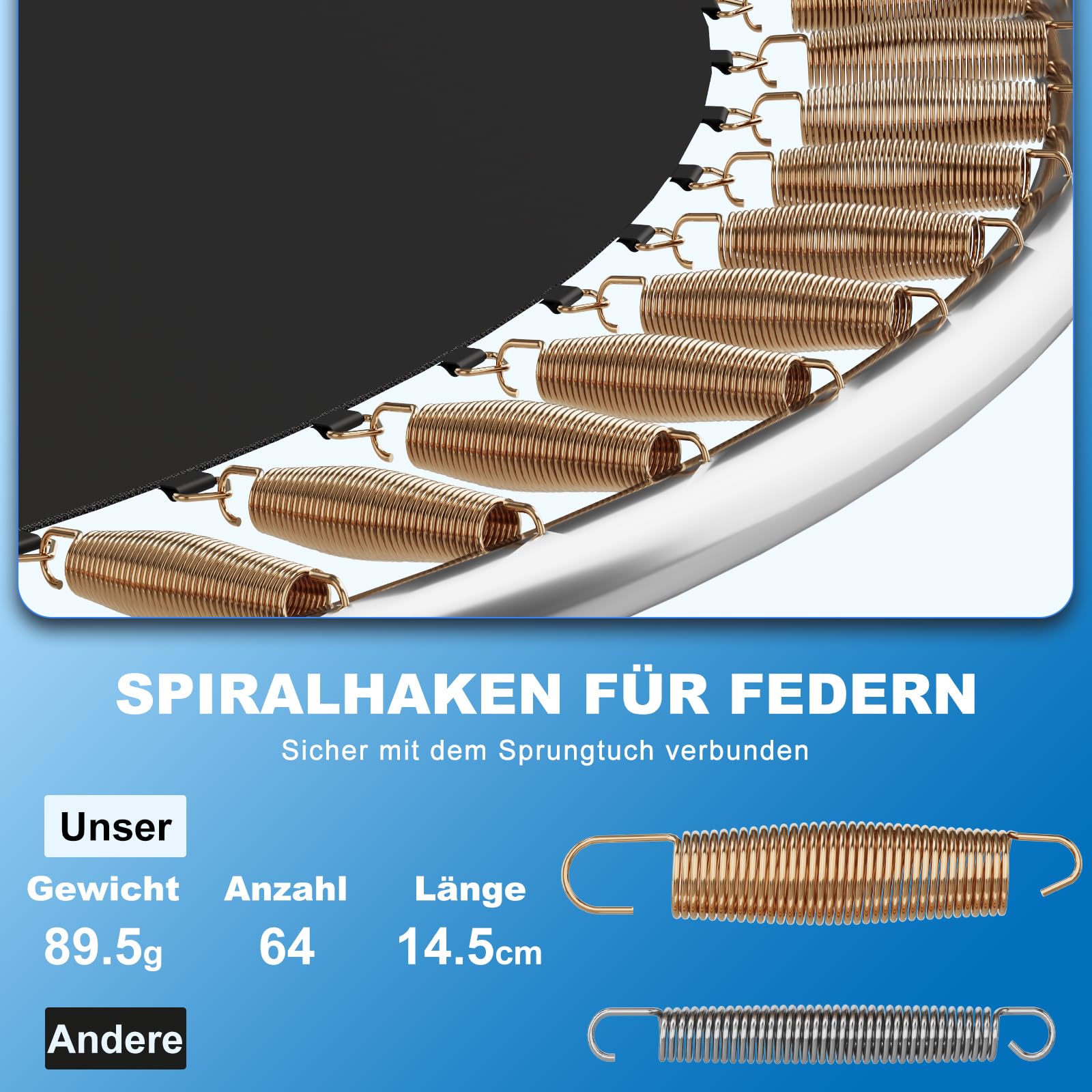 - 【Mehr Haltbarkeit und Sprungkraft】Das Trampolin besteht aus Stück hochfesten, verzinkten Stahlfedern. Das 305 cm lange Trampolin wird mit 64 robusten Federn mit Spulenhaken geliefert, die sicher an der Sprungmatte befestigt sind. Das Outdoor-Trampolin hat einen Gesamt-Sprungdurchmesser von 261 cm und verfügt über eine PP-UV-beständige Sprungmatte, die ein höheres und kontrollierteres Springen ermöglicht.