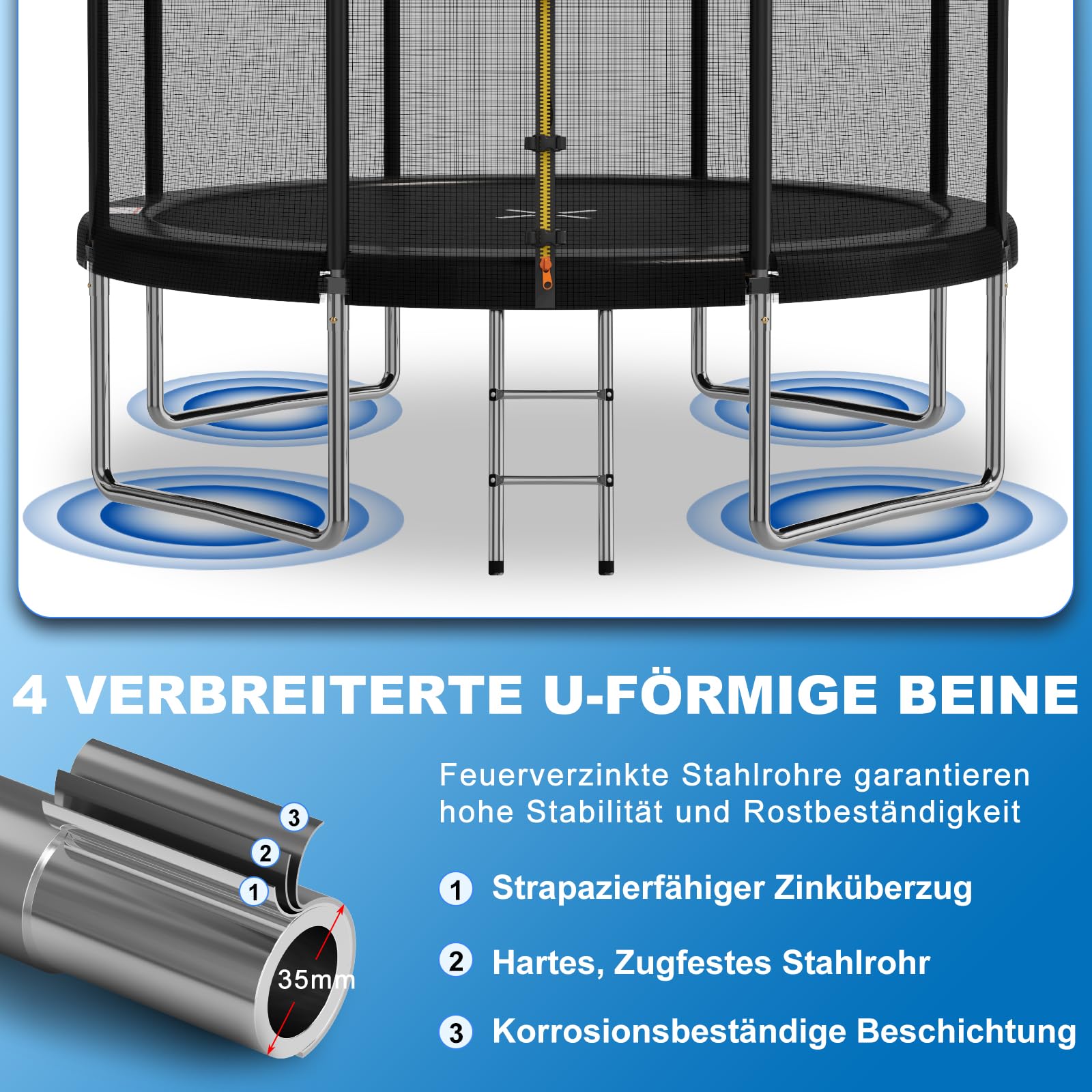 - 【Starke Rahmenkonstruktion】Die 4-Bein-Struktur des Trampolins besteht aus 35mm Stahlrohr, U-förmiges Design kann die Stabilität der Basis erhöhen, und T-Verbinder können den Rahmen verstärken. Die Sprungmatte ist aus 270g/m² PE, das Trampolin kann bis zu 150KG wiegen und kann für 2 Teenager oder 3 Kinder verwendet werden.Das Sprungtuch ist in acht Reihen genäht, um maximale Sicherheit und Reißfestigkeit zu gewährleisten.