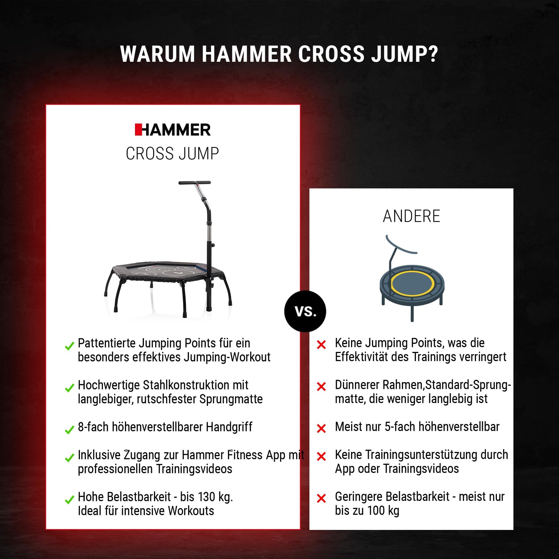 - PERFEKTES SPRUNGVERHALTEN: Das perfekte Sprungverhalten des Cross Jump liegt sowohl am Premium-Aufbau der Gummiseilzüge, als auch an der Profi-Sprungmatte aus widerstandsfähigem Industriewebstoff.