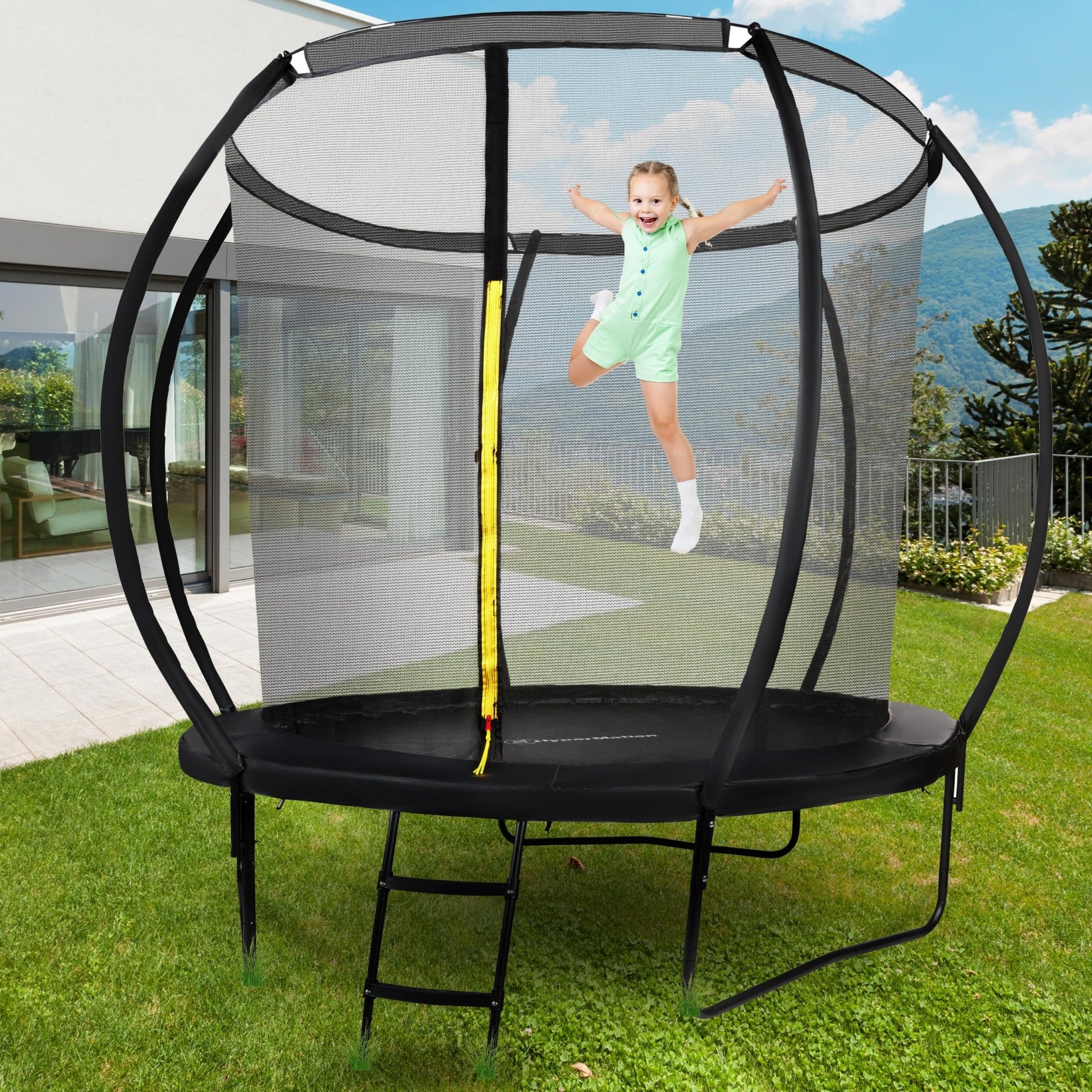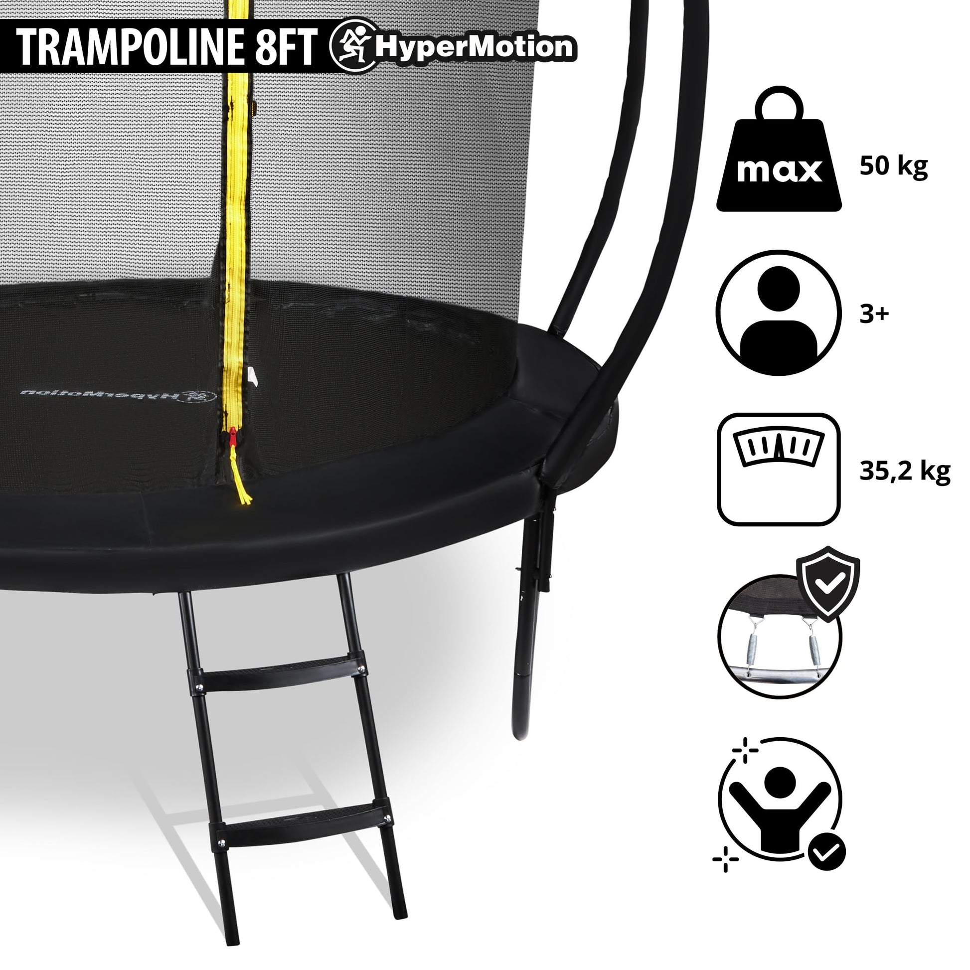 Einzelheiten: Kindertrampolin 244 cm mit Leiter und Innennetz HyperMotion – für Haus und Garten. Marke: HyperMotion Modell: Trampolin 8 Fuß. Hauptmerkmale: Trampolin aus robusten, hochwertigen Materialien. Hohe Witterungs- und UV-Beständigkeit. Schnell trocknend und wasserabweisend. Modernes minimalistisches Design. Kürbisform mit robustem Netz und Leiter für einfachen Einstieg. Ausgestattet mit 3 Doppelfüßen schwarz. Schnelle und einfache Montage. Geeignet für Kinder ab 3 Jahren. Spezifikationen: Abmessungen: 244 (T) x 214 cm. Sprungflächengröße: 204 cm. Höhe vom Boden bis zur Matte (Sprungmatte): ca. 68 cm. Höhe des Sicherheitsnetzes: ca. 146 cm. Verpackungsgröße: A: 128 x 45 x 14 cm. B: 102 x 45 x 10 cm. Gewicht: 35,2 kg. Material: Stahl, PVC, PE, PP. Maximale Belastung: 50 kg. Anzahl der Federn: 42