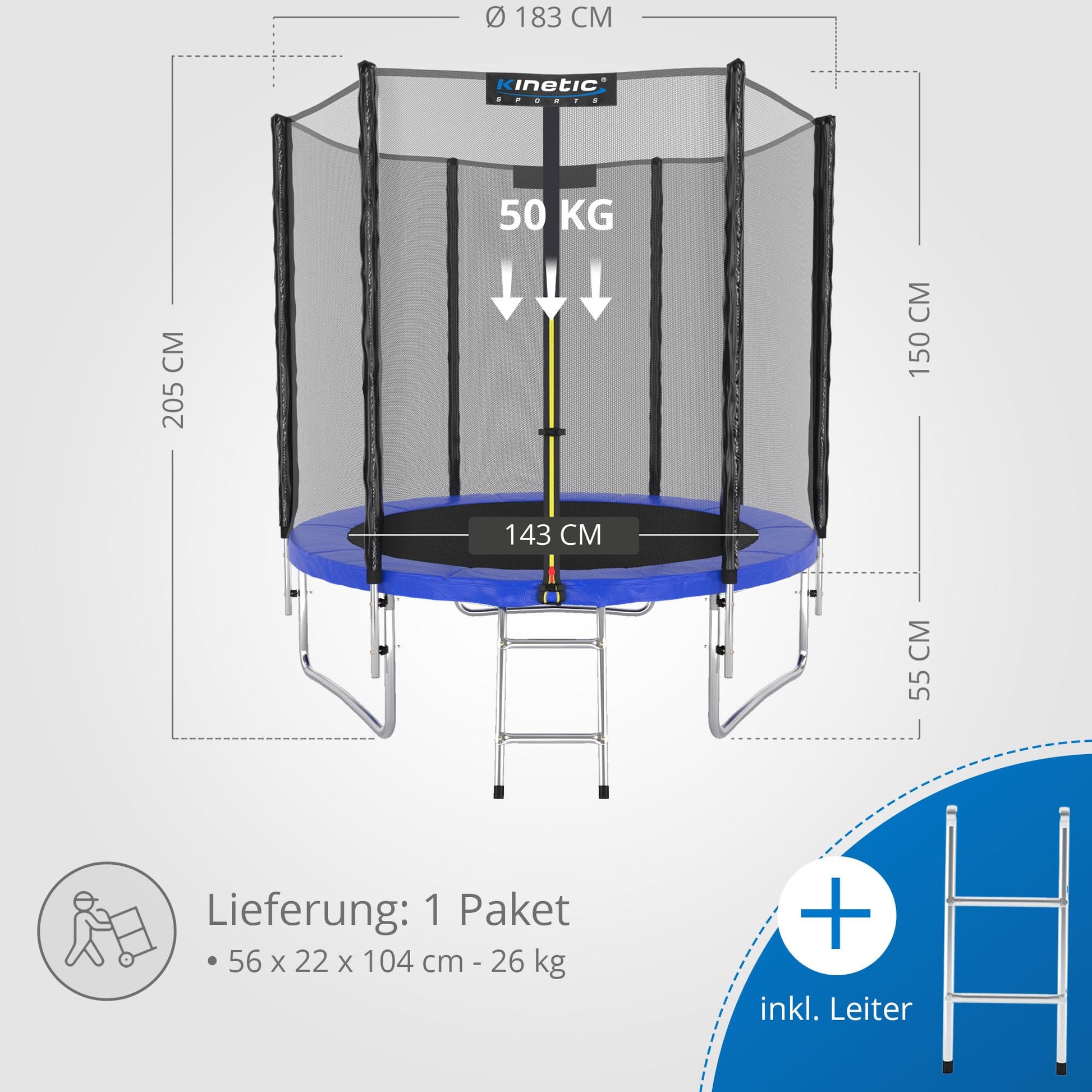 - ✅ PRODUKTDETAILS: Ø 183 cm, Sicherheitsnetz außenliegend, Höhe Sprungmatte: 55 cm, max. Benutzergewicht 50 kg. Das Outdoor Gartentrampolin von Kinetic Sports zeichnet sich durch eine qualitativ hochwertige Verarbeitung, hervorragende Sicherheitsaspekte und ein sehr gutes Preis-Leistungs-Verhältnis aus und ist perfekt für den Anwendungsbereich im Garten entwickelt worden.