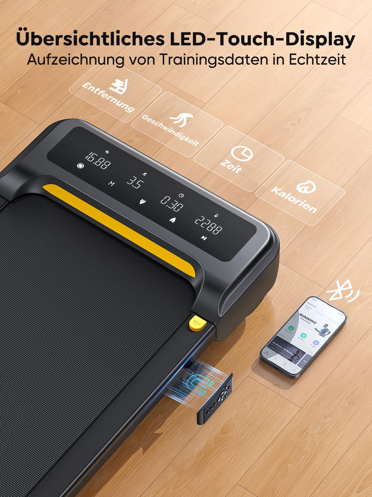 - 【Multifunktionsdisplay und Intelligente App】Das LED-Display zeigt deutlich Zeit, Distanz, Geschwindigkeit und Kalorien an, erfasst Ihren Trainingsstatus in Echtzeit und macht Ihre Trainingsdaten auf einen Blick klar. Dieses Walking Pad kann mit mehreren Sport-Apps verbunden werden und bietet verschiedene Trainingskurse. Sie können online mit anderen Läufern interagieren und sich austauschen und so ein umfassendes Sporterlebnis genießen.