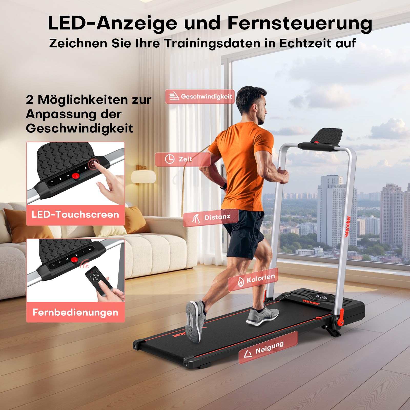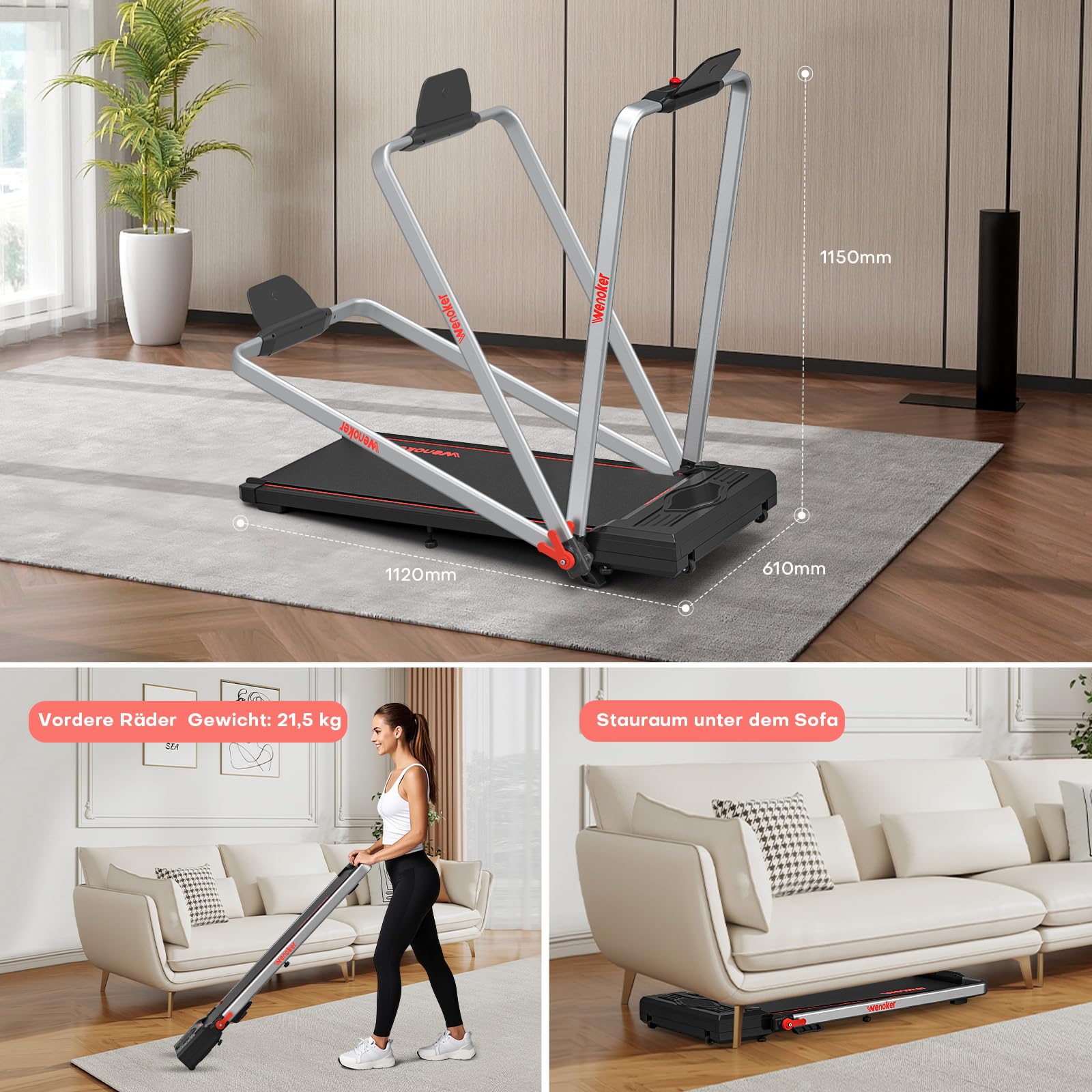 - Kompakte Lagerung spart Platz: Installationsfreies Design, fertig zum Kauf und zur Benutzung. Faltbare Größe: 122.5*57.2*11.5cm, Expandierende Größe: 119.5*49*107.4cm.Dieses Heim-Laufband wiegt 21.5kg,das Laufband ist leicht und hat zwei Vorderräder für einfache Bewegung. Sie können es am Fußende des Bettes oder unter dem Sofa platzsparend aufstellen.
