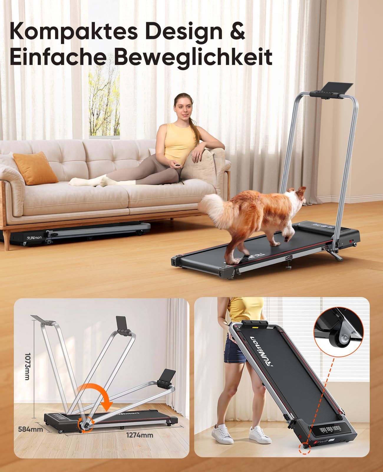 - [Kompaktes Laufband für Haus und Büro] Keine Installation Design, bereit, sofort zu verwenden. [Größe] 1270 * 584* 107mm, [Gewicht] 21 kg. Das Laufband unter dem Schreibtisch ist leicht und hat zwei Vorderräder für einfache Bewegung, Sie können es am Boden des Bettes oder unter dem Sofa platzieren, um Platz zu sparen.