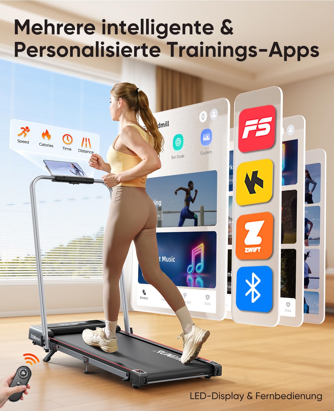 - [2-LED-Displays & Smart APP Unterstützung] Unser laufband klappbar für Zuhause ist mit zwei großen LED-Bildschirmen ausgestattet, die Ihren Trainingsstatus erfassen und Trainingsdaten in Echtzeit aufzeichnen. Außerdem kann es sich über Bluetooth mit Apps wie „FITSHOW“, „KINOMAP“ und „ZWIFT“ verbinden, um Ihre Trainingsdaten aufzuzeichnen. Sie können Ihr Smartphone oder Tablet auf dem abnehmbaren Ständer des Laufbands platzieren, um Filme/Musik zu genießen, während Sie trainieren oder App-Tutorials ansehen.