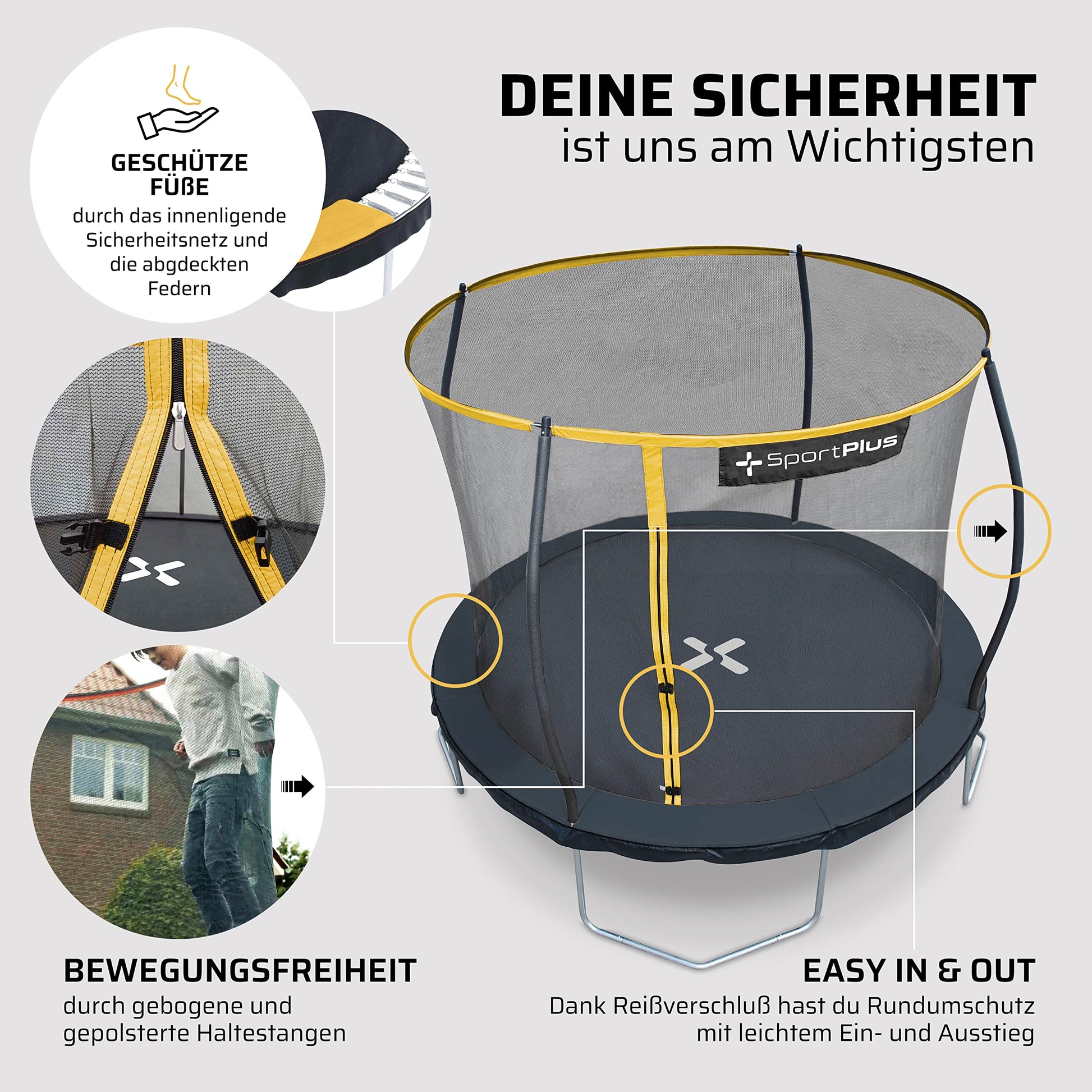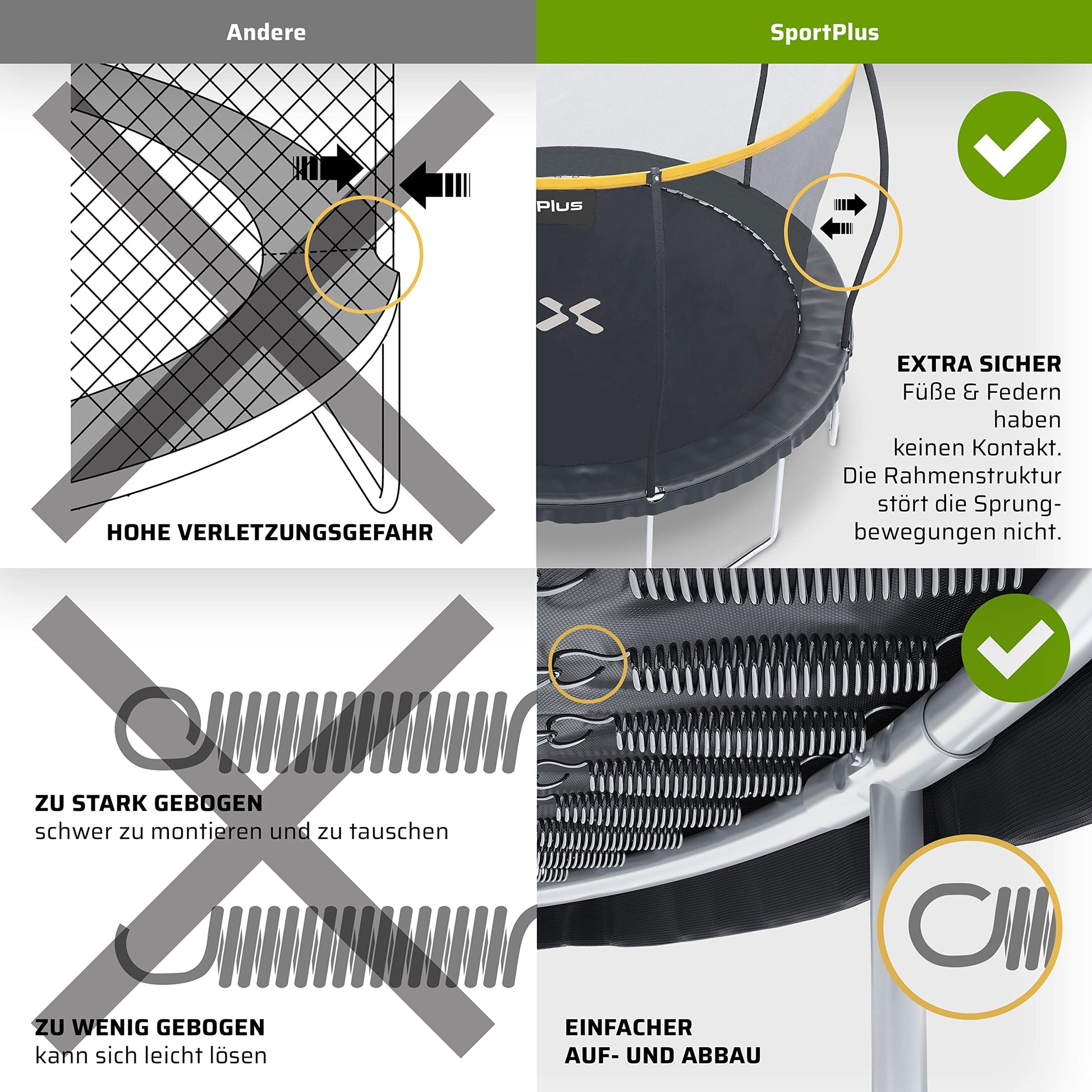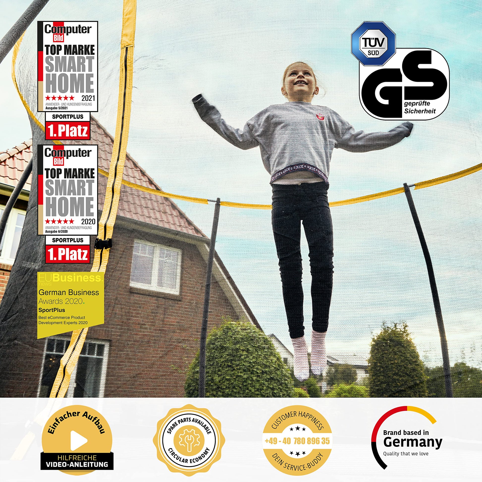 - 𝗚𝗘𝗣𝗥Ü𝗙𝗧𝗘 𝗦𝗜𝗖𝗛𝗘𝗥𝗛𝗘𝗜𝗧 - Sicherheit steht an erster Stelle! Unser Trampolin 305 cm und Trampolin 366 cm mit Netz verfügt über gepolsterte Außenstangen und ein innenliegendes Sicherheitsnetz. So verhindern wir, dass deine Kids beim Springen auf den Rand fallen oder gegen die Stangen stoßen – ein häufiges Problem bei vielen anderen Modellen. Zusätzlich sorgt die verstärkte Rahmenkonstruktion mit vier extrem stabilen Beinen für maximale Standfestigkeit. Für deine Sicherheit wurde das Trampolin durch den TÜV SÜD GS zertifiziert!
