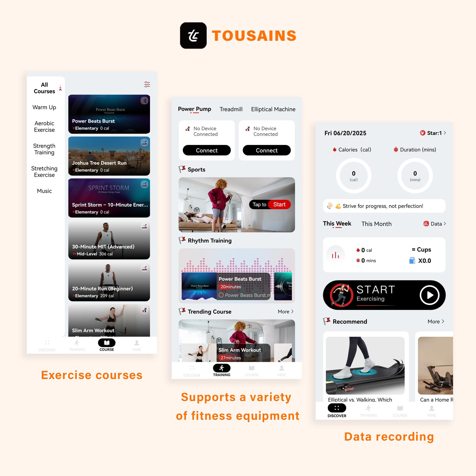 - [APP Unterstützung] Das Laufband unterstützt die Anbindung an gängige Apps auf dem Markt wie Zwift, Kinomap, einschließlich unserer selbst entwickelten App-"TOUSAINS", um Trainingsdaten in Echtzeit zu sehen, und können auch das Laufband anstelle der Fernbedienung steuern. Die App bietet eine große Auswahl an Kursen, so dass Sie den für passenden Kurs auswählen können, um Ihre Trainingsergebnisse zu verbessern.
