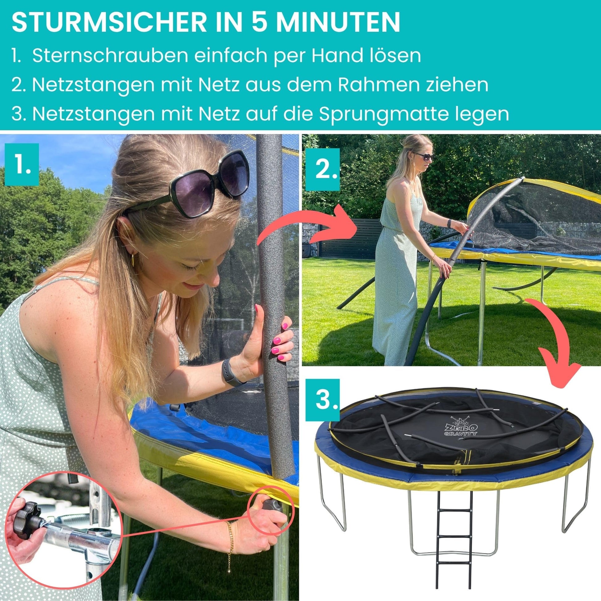 - ✅ STURMSICHER IN NUR 5 MINUTEN - Sicherheitsnetze bieten bei starkem Wind eine große Angriffsfläche. Umherfliegende Outdoor-Trampoline sorgen für teure Schäden. Um einen schnellen & unkomplizierten Abbau zu gewährleiten, verfügt unser Gartentrampolin über ein einzigartiges System bei dem das Sicherheitsnetz in nur 5 Minuten und ohne Werkzeug komplett herabgelassen werden kann. Ebenso schnell erfolgt auch der Aufbau.